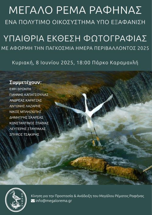 Με αφορμή την Παγκόσμια Ημέρα Περιβάλλοντος 2025, η Κίνηση για την Προστασία και την Ανάδειξη του Μεγάλου Ρέματος Ραφήνας διοργανώνει υπαίθρια έκθεση φωτογραφίας με θέμα: «ΜΕΓΑΛΟ ΡΕΜΑ ΡΑΦΗΝΑΣ: ΕΝΑ ΠΟΛΥΤΙΜΟ ΟΙΚΟΣΥΣΤΗΜΑ ΥΠΟ ΕΞΑΦΑΝΙΣΗ» την Κυριακή, 8 Ιουνίου 2025, ώρες 18:00-21:00 στο Πάρκο Καραμανλή στη Ραφήνα.