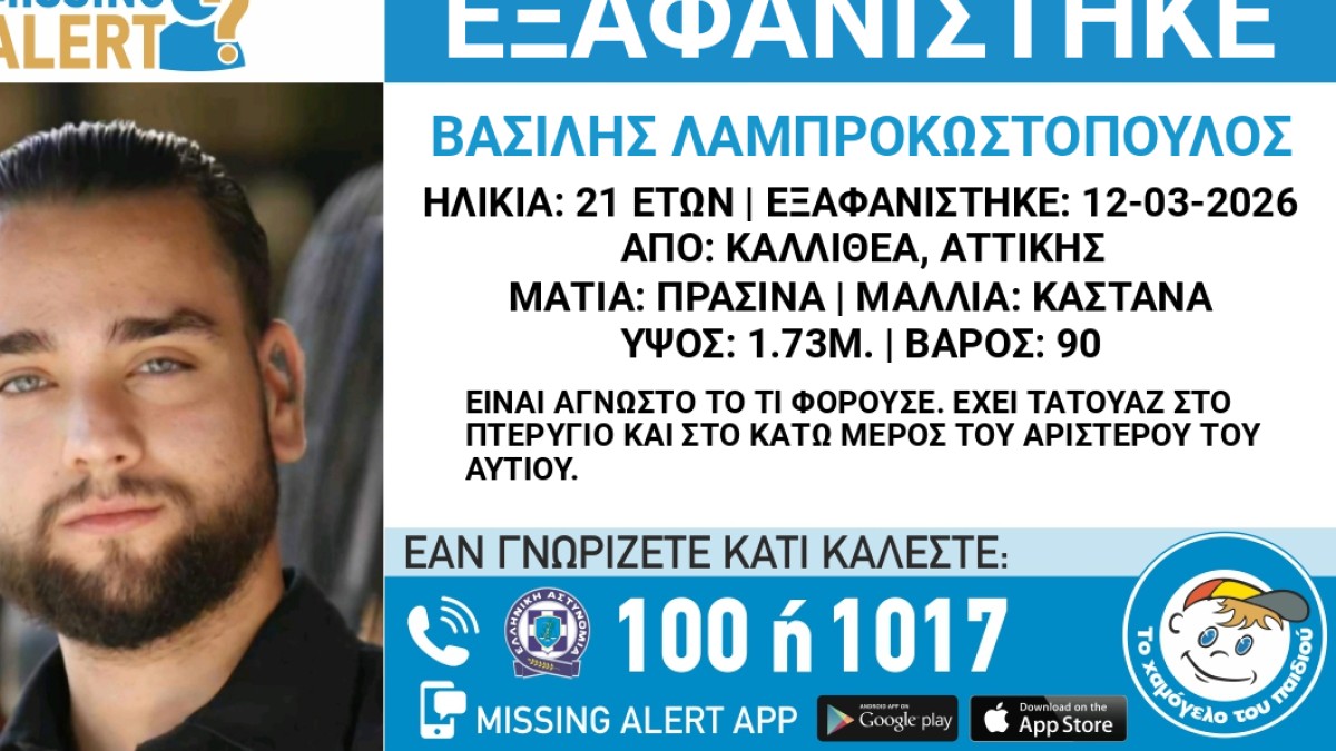 Συναγερμός έχει σημάνει στις Αρχές για την εξαφάνιση του 21χρονου Βασίλη Λαμπροκωστόπουλου από την Καλλιθέα, με την υπόθεση να εξελίσσεται σε θρίλερ όσο περνούν οι ημέρες χωρίς κανένα ίχνος ζωής.