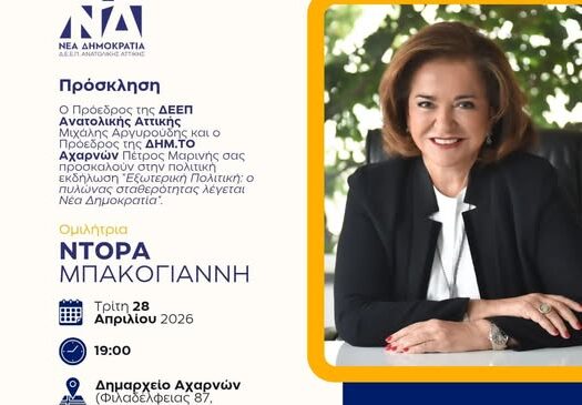 Η ΔΕΕΠ Ανατολικής Αττικής και η ΔημΤΟ ΝΔ Αχαρνών-Θρακομακεδόνων σας προσκαλούν σε μια σημαντική πολιτική εκδήλωση με θέμα την εξωτερική πολιτική της χώρας και τις προκλήσεις της εποχής.