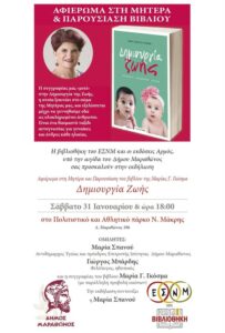 Ομιλητές: Μαρία Σπανού Αντιδημαρχος Υγείας, Γιώργος Μπάρδης φιλόλογος & η συγγραφέας του βιβλίου Μαρία Γκόσμα μαία.