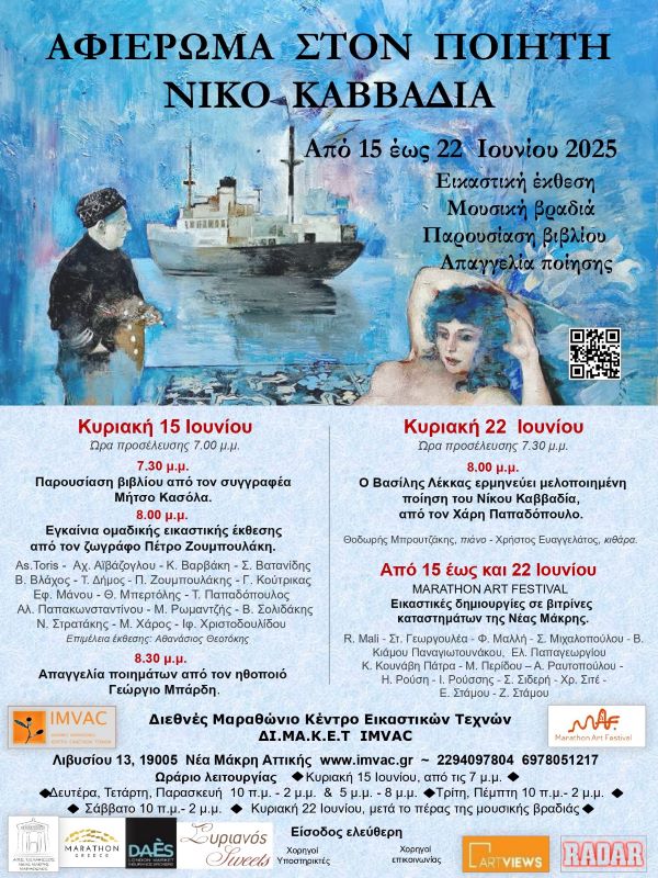Με αφορμή την επετειακή συμπλήρωση των 50 χρόνων από τον θάνατο του Έλληνα ποιητή, Νίκου Καββαδία, το Διεθνές Μαραθώνιο Κέντρο Εικαστικών Τεχνών ΔΙ.ΜΑ.ΚΕ.Τ. και το MARATHON ART FESTIVAL με την υποστήριξη του συλλόγου Α.Π.Σ. ΤΕΛΜΗΣΣΟΣ ΝΕΑΣ ΜΑΚΡΗΣ ΜΑΡΑΘΩΝΟΣ, έχουν τη χαρά να παρουσιάσουν ένα αφιέρωμα στην ποίηση του Νίκου Καββαδία, το οποίο αναδεικνύει τον συνδυασμό της Ποίησης, των Εικαστικών Τεχνών, της Μουσικής και του Τραγουδιού με μοναδικό τρόπο στοχεύοντας να απεικονίσει την πολυπολιτισμική κληρονομιά και το πνεύμα του ποιητή μας.