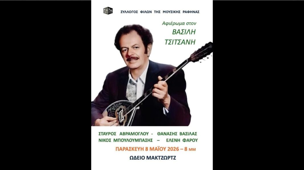 Ο Σύλλογος Φίλων της Μουσικής Ραφήνας διοργανώνει μια ξεχωριστή μουσική βραδιά αφιερωμένη σε έναν από τους σημαντικότερους δημιουργούς του ελληνικού λαϊκού τραγουδιού, τον Βασίλη Τσιτσάνη. Η εκδήλωση θα πραγματοποιηθεί την Παρασκευή 8 Μαΐου 2026, στις 8 το βράδυ, στο Ωδείο Μακτζώρτζ (Ευβοϊκού 35, Ραφήνα), με ελεύθερη είσοδο για το κοινό.
