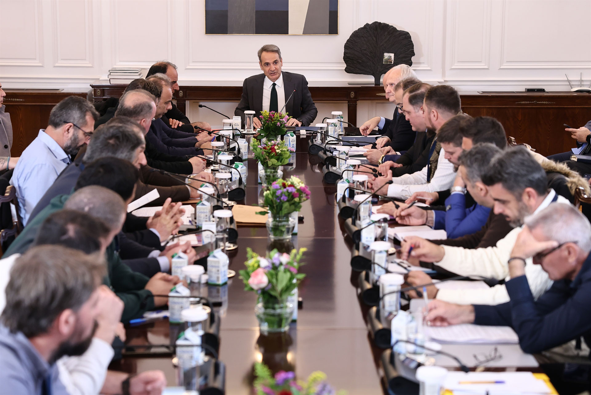 Περισσότερες από τέσσερις ώρες διήρκεσε η συνάντηση στο Μέγαρο Μαξίμου του πρωθυπουργού Κυριάκου Μητσοτάκη με τους εκπροσώπους των αγροτών της πανελλαδικής επιτροπής, oι οποίοι δεν είχαν προσέλθει στην πρώτη συνάντηση της περασμένης εβδομάδας. Ξεκινώντας ο πρωθυπουργός τόνισε ότι η συζήτηση κατά την άποψή του «έπρεπε να είχε γίνει νωρίτερα», υπογραμμίζοντας ότι η κυβέρνηση έχει ήδη κινηθεί «σε πολλά επίπεδα και έχουμε αντιμετωπίσει ζητήματα τα οποία διαχρονικά έχετε θέσει». Αυτό πάντως που είχε ξεκαθαριστεί εξαρχής από την κυβέρνηση είναι ότι δεν πρόκειται να υπάρξει αλλαγή σε όσα είχαν εξαγγελθεί, καθώς δεν υπάρχει δημοσιονομικό περιθώριο για επιπλέον μέτρα, με τον πρωθυπουργό να εκφράζει την επιθυμία να γίνει ένας ειλικρινής διάλογος, κάτι που επιβεβαιώθηκε στην πορεία της κουβέντας.