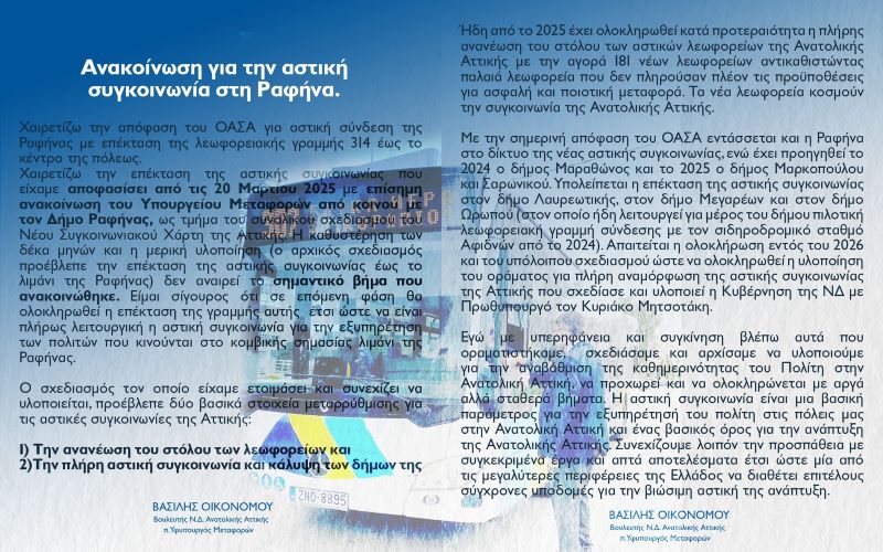 Χαιρετίζω την επέκταση της αστικής συγκοινωνίας που είχαμε αποφασίσει από τις 20 Μαρτίου 2025 με επίσημη ανακοίνωση του Υπουργείου Μεταφορών από κοινού με τον Δήμο Ραφήνας, ως τμήμα του συνολικού σχεδιασμού του Νέου Συγκοινωνιακού Χάρτη της Αττικής. Η καθυστέρηση των δέκα μηνών και η μερική υλοποίηση (ο αρχικός σχεδιασμός προέβλεπε την επέκταση της αστικής συγκοινωνίας έως το λιμάνι της Ραφήνας) δεν αναιρεί το σημαντικό βήμα που ανακοινώθηκε. Είμαι σίγουρος ότι σε επόμενη φάση θα ολοκληρωθεί η επέκταση της γραμμής αυτής έτσι ώστε να είναι πλήρως λειτουργική η αστική συγκοινωνία για την εξυπηρέτηση των πολιτών που κινούνται στο κομβικής σημασίας λιμάνι της Ραφήνας.