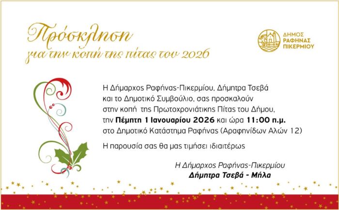 στην κοπή της Πρωτοχρονιάτικης πίτας του Δήμου, την Πέμπτη 1 Ιανουαρίου 2026 και ώρα 11:00 π.μ. στο Δημοτικό Κατάστημα Ραφήνας (Αραφηνίδων Αλών 12)