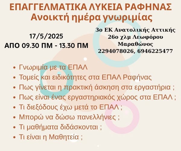 Ανοικτή Ημέρα Γνωριμίας με τα Επαγγελματικά Λύκεια Ραφήνας, το Σάββατο 17 Μαΐου – rpn