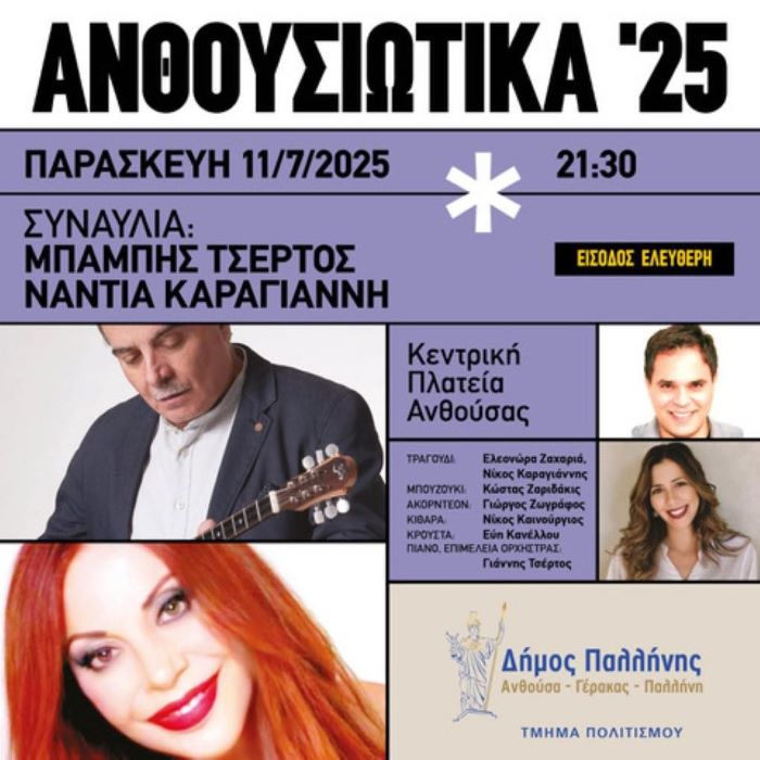 Ο Δήμος Παλλήνης, μέσω του Τμήματος Πολιτισμού, στο πλαίσιο των πολιτιστικών εκδηλώσεων «Ανθουσιώτικα 2025», σας προσκαλεί σε μια ξεχωριστή μουσική βραδιά, την Παρασκευή 11 Ιουλίου 2025, στην Κεντρική Πλατεία Ανθούσας.