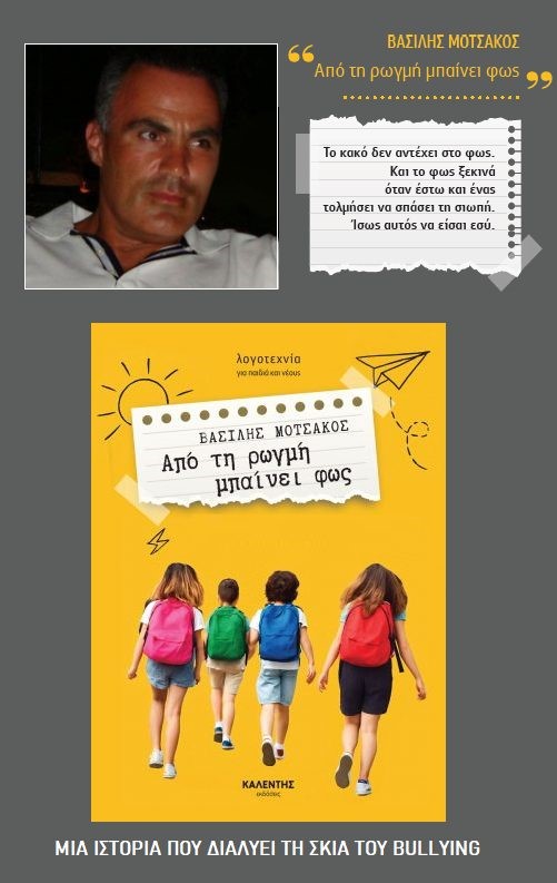 Ο Βασίλης Μοτσάκος, εκπαιδευτικός με πολυετή πορεία τόσο στην ιδιωτική όσο και στη δημόσια εκπαίδευση, υπογράφει το πρώτο του βιβλίο παιδικής μυθοπλασίας με τίτλο «Από τη ρωγμή μπαίνει φως». Ένα έργο εμπνευσμένο από αληθινά γεγονότα, που ακουμπά με ευαισθησία και ρεαλισμό ένα από τα πιο κρίσιμα ζητήματα της σχολικής ζωής: τον σχολικό εκφοβισμό.