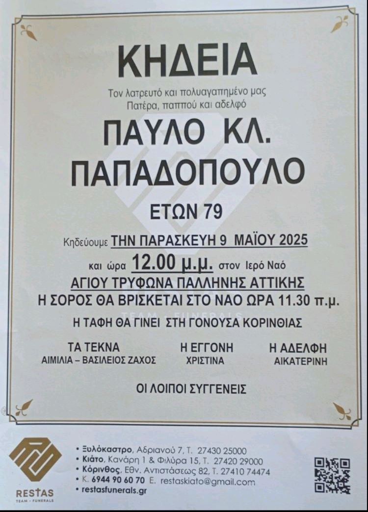 Η εξόδιος ακολουθία θα τελεστεί την Παρασκευή στις 12:00 το μεσημέρι, στον Ιερό Ναό Αγίου Τρύφωνος στην Παλλήνη.