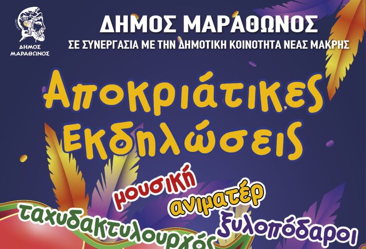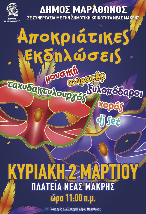 Οι αποκριάτικες εκδηλώσεις του Δήμου Μαραθώνα φτάνουν στο αποκορύφωμά τους σήμερα, Κυριακή 2 Μαρτίου 2025, στις 11:00 π.μ., στην κεντρική πλατεία Νέας Μάκρης!