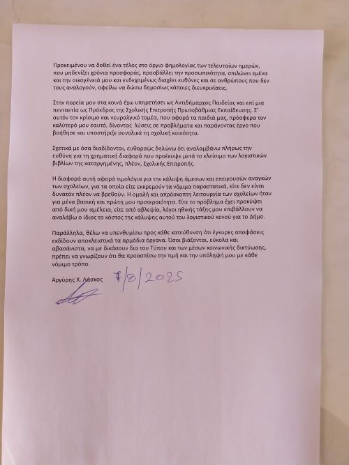 Σχετικά με όσα διαδίδονται, ευθαρσώς δηλώνω ότι αναλαμβάνω πλήρως την ευθύνη για τη χρηματική διαφορά που προέκυψε μετά το κλείσιμο των λογιστικών βιβλίων της καταργημένης, πλέον, Σχολικής Επιτροπής.