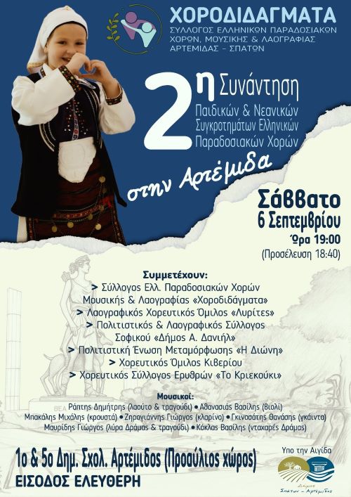 Ο Σύλλογος «ΧΟΡΟΔΙΔΑΓΜΑΤΑ – ΣΥΛΛΟΓΟΣ ΔΙΑΣΩΣΗΣ ΚΑΙ ΔΙΑΔΟΣΗΣ ΕΛΛΗΝΙΚΩΝ ΠΑΡΑΔΟΣΙΑΚΩΝ ΧΟΡΩΝ, ΜΟΥΣΙΚΗΣ & ΛΑΟΓΡΑΦΙΑΣ ΑΡΤΕΜΙΔΟΣ – ΣΠΑΤΩΝ» διοργανώνει για δεύτερη χρονιά εκδήλωση με τίτλο «2η Συνάντηση Παιδικών & Νεανικών Συγκροτημάτων Ελληνικών Παραδοσιακών Χορών στην Αρτέμιδα» το Σάββατο 06 Σεπτεμβρίου 2025 και ώρα 19:00 (ώρα προσέλευσης 18:40) στον χώρο του 1ου Δημοτικού Σχολείου Αρτέμιδος που βρίσκεται επί των οδών Σπετσών και Θεμιστοκλέους στην Αρτέμιδα.