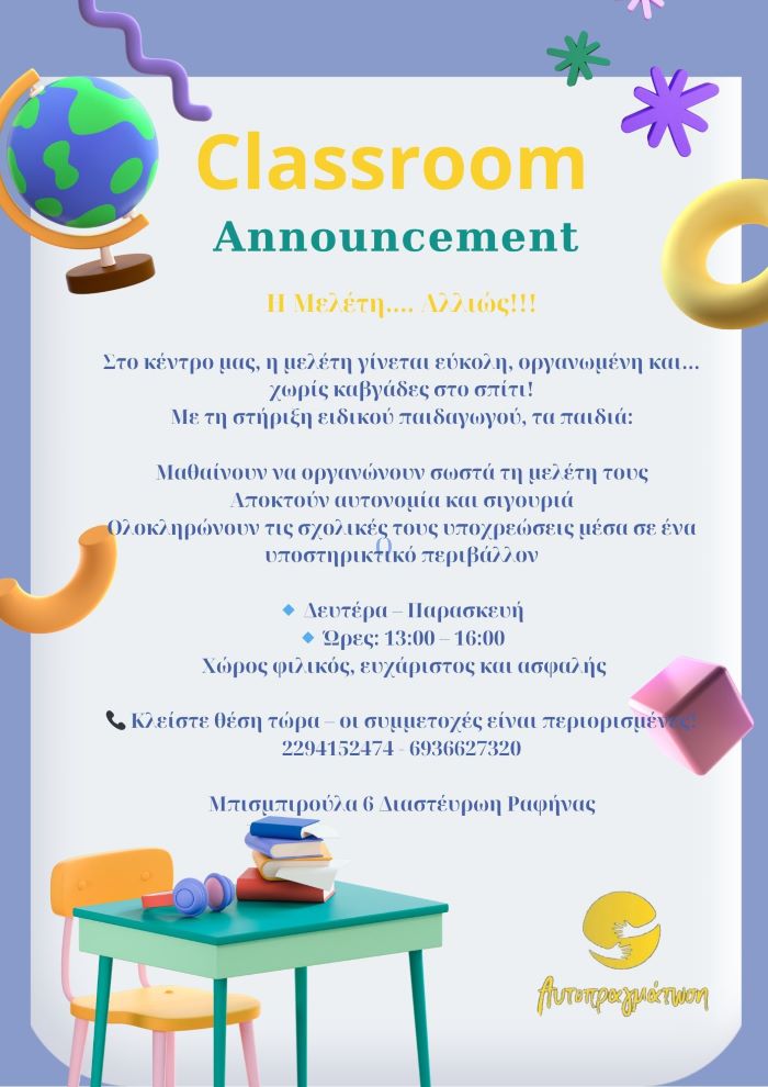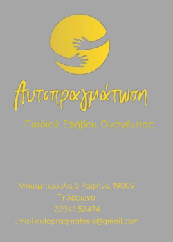 Η μελέτη των μαθημάτων δεν χρειάζεται να είναι πια συνώνυμη με άγχος και καβγάδες στο σπίτι. Στο κέντρο «Αυτοπραγμάτωση Ραφήνας» η σχολική μελέτη γίνεται οργανωμένα, ευχάριστα και αποτελεσματικά, με την καθοδήγηση ειδικού παιδαγωγού.