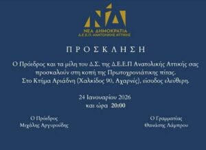 Εκδήλωση με αφορμή την κοπή της πρωτοχρονιάτικης πίτας πραγματοποιεί η ΔΕΕΠ Ανατολικής Αττικής, όπου αναμένεται να δώσουν το παρών άπαντες οι πολιτικοί και τοπικοί παράγοντες της ευρύτερης περιοχής