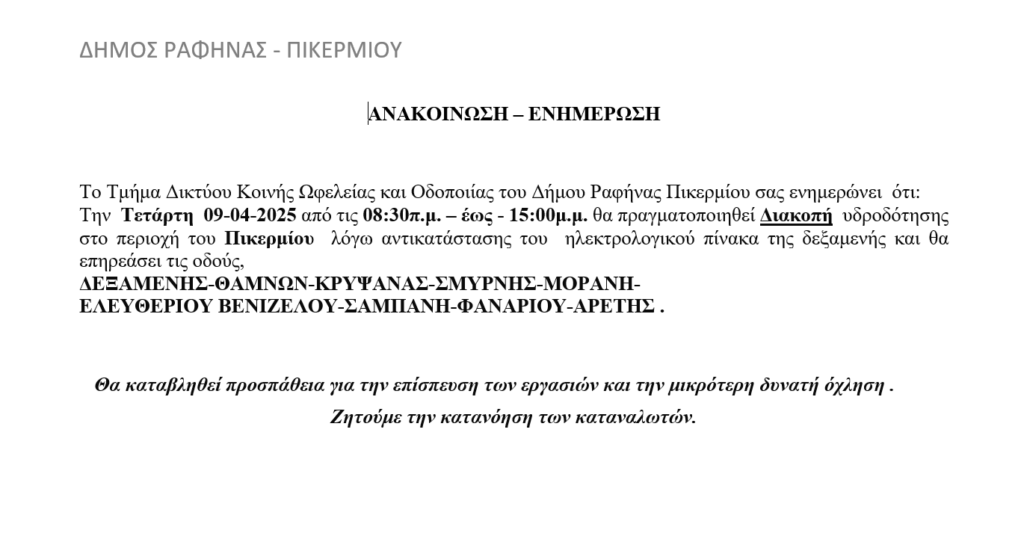 ΡΑΦΗΝΑ - ΠΙΚΕΡΜΙ Λιγότερο από 1 λεπταΑνάγνωση Διακοπή υδροδότησης στο Πικέρμι – rpn 9 Απριλίου, 2025 FacebookTwitterPinterestWhatsApp Διακοπή υδροδότησης στην περιοχή του Πικερμίου Συγκεκριμένα: Tagsδιακοπή νερού πικέρμι Αυτή την εβδομάδα ΕΙΔΗΣΕΙΣ ΔΙΕΘΝΗΣ ΕΙΔΗΣΕΙΣ 21/12/2025 20 Δεκεμβρίου, 2025 0 https://youtu.be/S7AFs_PQBaY Παραπολιτικά Η σιωπή ενός ανθρώπου που ξέρει 20 Δεκεμβρίου, 2025 0 Ο άνθρωπος που κάποτε διάβαζε τα gallop πριν ακόμα... ΕΚΔΗΛΩΣΕΙΣ Λευκή Νύχτα Ραφήνας: όταν η πόλη έγινε γιορτή – φωτογραφίες – πολλά βίντεο RPN 20 Δεκεμβρίου, 2025 0 Η Ραφήνα έζησε το βράδυ της Παρασκευής μια από... ΡΑΦΗΝΑ - ΠΙΚΕΡΜΙ Παραμονή Χριστουγέννων στη Ραφήνα: Ζωντανή μουσική και γιορτινό μενού στο Άσπρο Γίδι 20 Δεκεμβρίου, 2025 0 Παραμονή Χριστουγέννων και η Ραφήνα δεν… κοιμάται. Στην καρδιά... Παραπολιτικά Το παραμύθι του Μπουμπουνόβι και των χωριών με αυτιά 20 Δεκεμβρίου, 2025 0 Μια φορά κι έναν καιρό, σε μια γωνιά του... ΝΕΑ ΕΙΔΗΣΕΙΣ ΔΙΕΘΝΗΣ ΕΙΔΗΣΕΙΣ 21/12/2025 0 https://youtu.be/S7AFs_PQBaY Παραπολιτικά Η σιωπή ενός ανθρώπου που ξέρει 0 Ο άνθρωπος που κάποτε διάβαζε τα gallop πριν ακόμα... ΕΚΔΗΛΩΣΕΙΣ Λευκή Νύχτα Ραφήνας: όταν η πόλη έγινε γιορτή – φωτογραφίες – πολλά βίντεο RPN 0 Η Ραφήνα έζησε το βράδυ της Παρασκευής μια από... ΡΑΦΗΝΑ - ΠΙΚΕΡΜΙ Παραμονή Χριστουγέννων στη Ραφήνα: Ζωντανή μουσική και γιορτινό μενού στο Άσπρο Γίδι 0 Παραμονή Χριστουγέννων και η Ραφήνα δεν… κοιμάται. Στην καρδιά... Παραπολιτικά Το παραμύθι του Μπουμπουνόβι και των χωριών με αυτιά 0 Μια φορά κι έναν καιρό, σε μια γωνιά του... ΡΑΦΗΝΑ - ΠΙΚΕΡΜΙ Έμυ Κροκίδη: Τι λέει η ψυχολογία για τους τοξικούς ανθρώπους του Δημοτικού Συμβουλίου Ραφήνας Πικερμίου – rpn 0 Την δουλειά των ψυχολόγων θα πάρει όπως φαίνεται η... ΜΑΡΑΘΩΝΑΣ - ΝΕΑ ΜΑΚΡΗ Μάτι: Μουσικό ρεβεγιόν στο Άρτιον την Τετάρτη 24/12, Παραμονή Χριστουγέννων 0 Τήν Τετάρτη 24/12, Παραμονή Χριστουγέννων ένα μουσικό ρεβεγιόν στο... ΖΩΔΙΑ Τα ζώδια σήμερα Σάββατο 20/12 – rpn 0 Αναλυτικά οι προβλέψεις της ημέρας για όλα τα ζώδια ... RPN.GR Λευκή Νύχτα Ραφήνας: όταν η πόλη έγινε γιορτή – φωτογραφίες – πολλά βίντεο RPN ΕΚΔΗΛΩΣΕΙΣ 20 Δεκεμβρίου, 2025 Παραμονή Χριστουγέννων στη Ραφήνα: Ζωντανή μουσική και γιορτινό μενού στο Άσπρο Γίδι ΡΑΦΗΝΑ - ΠΙΚΕΡΜΙ 20 Δεκεμβρίου, 2025 Έμυ Κροκίδη: Τι λέει η ψυχολογία για τους τοξικούς ανθρώπους του Δημοτικού Συμβουλίου Ραφήνας Πικερμίου – rpn ΡΑΦΗΝΑ - ΠΙΚΕΡΜΙ 20 Δεκεμβρίου, 2025 Πρόσκληση και Χριστουγεννιάτικες ευχές από τον Βασίλη Οικονόμου – rpn ΜΑΡΑΘΩΝΑΣ - ΝΕΑ ΜΑΚΡΗ 20 Δεκεμβρίου, 2025 Σύγκρουση μετά τη «Λευκή Νύχτα» στη Ραφήνα: Δύο αυτοκίνητα τράκαραν στην Κυπρίων Αγωνιστών – rpn ΡΑΦΗΝΑ - ΠΙΚΕΡΜΙ 20 Δεκεμβρίου, 2025 ΕΙΔΗΣΕΙΣΡΑΦΗΝΑ - ΠΙΚΕΡΜΙΑΘΛΗΤΙΚΑΜΑΡΑΘΩΝΑΣ - ΝΕΑ ΜΑΚΡΗΕΚΔΗΛΩΣΕΙΣΔΙΑΦΟΡΑΤΟΠΙΚΗ ΚΟΙΝΩΝΙΑ Προηγούμενο άρθροΝεκρή πρώην Μις Ευρώπη στην Τουρκία – Έπεσε από γέφυρα για να αποφύγει το αλκοτέστ – rpnΕπόμενο άρθροΚουτουμάνου – Λυκουρέζου: Όσα έγιναν στην τηλεδιάσκεψη για να τα βρουν εξωδικαστικά – RPN