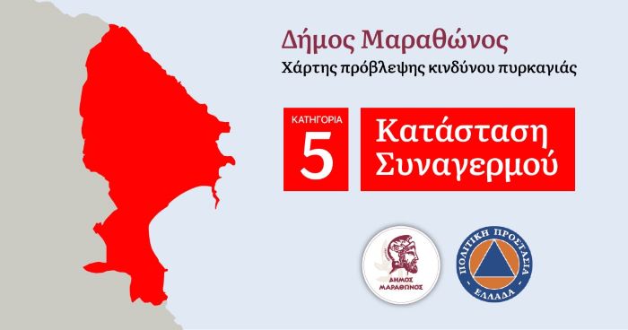 Με εντολή του Δημάρχου Μαραθώνος κ. Στέργιου Τσίρκα και συντονισμό του Αντιδημάρχου Πολιτικής Προστασίας κ. Ευάγγελου Κυπαρίσση, οι αρμόδιες υπηρεσίες του Δήμου και οι Εθελοντικές Ομάδες του Δήμου μας τίθενται σε κατάσταση συναγερμού και προχωρούν στην άμεση λήψη όλων των προβλεπόμενων μέτρων και δράσεων αυξημένης ετοιμότητας λόγω πολύ υψηλής επικινδυνότητας εκδήλωσης και εξάπλωσης δασικών πυρκαγιών, σύμφωνα με τον σχεδιασμό του Δήμου για την προβλεπόμενη κατηγορία. RED CODE