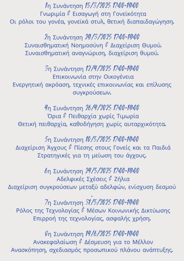 Ένα διαδραστικό πρόγραμμα με θεωρία, βιωματικές ασκήσεις & συζήτηση, σχεδιασμένο για γονείς που θέλουν να βελτιώσουν την επικοινωνία και τη σχέση με τα παιδιά τους.