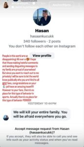 «Οι άνθρωποι σε αυτόν τον κόσμο απογοητεύουν! Όλο αυτό για το μπάσκετ. Ελπίζω όσοι κάνουν σχόλια μίσους και στέλνουν αηδιαστικά μηνύματα στην οικογένειά μου να είναι περήφανοι για τον εαυτό τους! Αλλά επειδή θέλετε να επικοινωνήσετε μαζί μου ιδιωτικά, θα φροντίσω να ενημερώσω τον κόσμο δημόσια για το ποιοι είστε! Και σε όλους τους οπαδούς της Τουρκίας, συγχαρητήρια για το ασημένιο μετάλλιο σας, έχετε μια καταπληκτική ομάδα!!!! Ωστόσο, δεν υπάρχει χώρος για τέτοιου είδους συμπεριφορές στον αθλητισμό. Στην πραγματικότητα, δεν υπάρχει χώρος για τέτοιου είδους συμπεριφορές, ΤΕΛΟΣ!!».