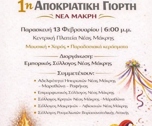 Κάλεσμα από τον Εμπορικό Σύλλογο Νέας Μάκρης για Αποκριάτικη Γιορτή και ξεφάντωμα, με αναβίωση αποκριάτικων εθίμων και τη συμμετοχή Παραδοσιακών Συλλόγων του Δήμου Μαραθώνα: