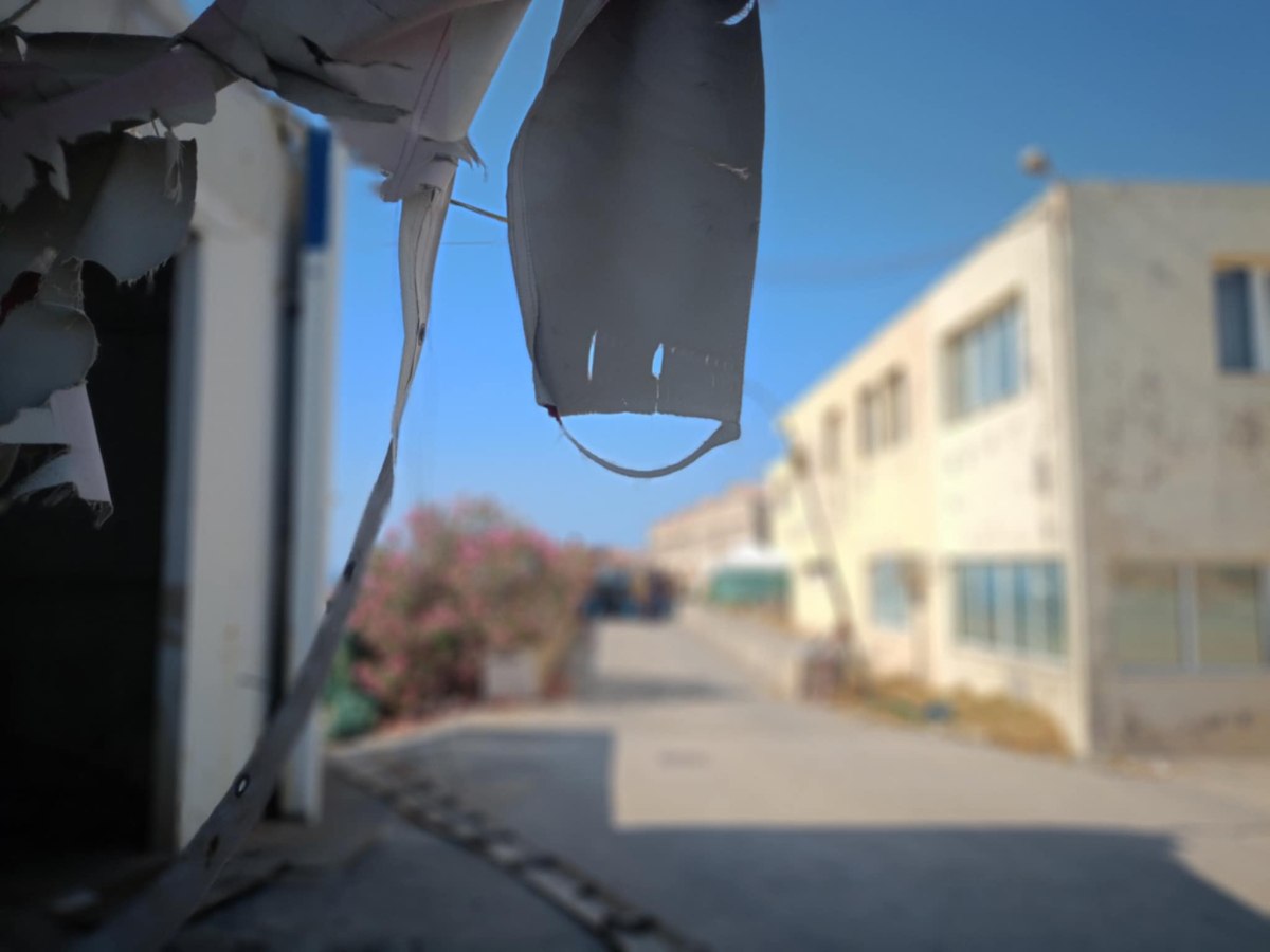 Μέσα, βρίσκονται κλεισμένοι για εβδομάδες εκατοντάδες άνθρωποι που έχουν καταλάβει διαφορετικές γωνίες ανάλογα με την εθνικότητά τους. Το κοινό που μοιράζονται είναι ότι είναι ξαπλωμένοι σε ένα πάτωμα, τα υλικά του οποίου δεν επιλέχθηκαν με την πρόβλεψη ότι θα φιλοξενήσουν ανθρώπινα σώματα, αλλά ρόδες φορτηγών και καφάσια. Η αίθουσα είναι ένας κλίβανος που πολλαπλασιάζει τη ζέστη, αλλά και την ανυπόφορη μυρωδιά – ένα κοκτέιλ κλεισούρας, ιδρώτα και απλυσιάς. Ο ήχος εναλλάσσεται ανάμεσα στη σιωπή της θερμοπληξίας και τις εκρήξεις με φωνές που προσπαθούν να δηλώσουν ότι δεν αντέχουν άλλο σε γλώσσες που κανείς από τους αποδέκτες του μηνύματος -τους δημοσιογράφους και τις αρχές- δεν καταλαβαίνει.