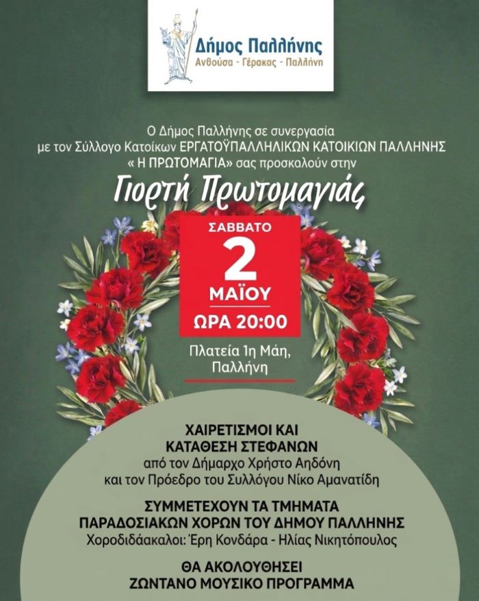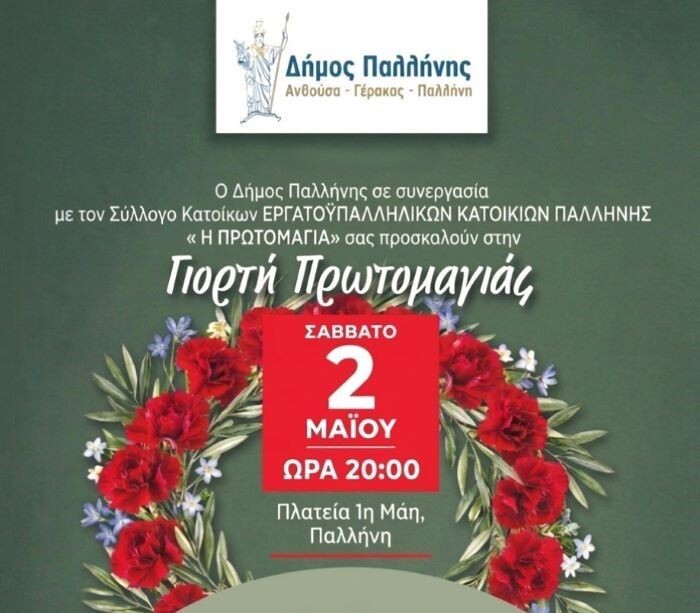 Ο Δήμος Παλλήνης και ο Σύλλογος Κατοίκων Εργατοϋπαλληλικών Κατοικιών Παλλήνης «Η Πρωτομαγιά», συνδιοργανώνουν και σας προσκαλούν σε μια εκδήλωση αφιερωμένη στην Παγκόσμια Ημέρα Εργατικής Πρωτομαγιάς, τιμώντας την ιστορική μνήμη και τους αγώνες των εργαζομένων.