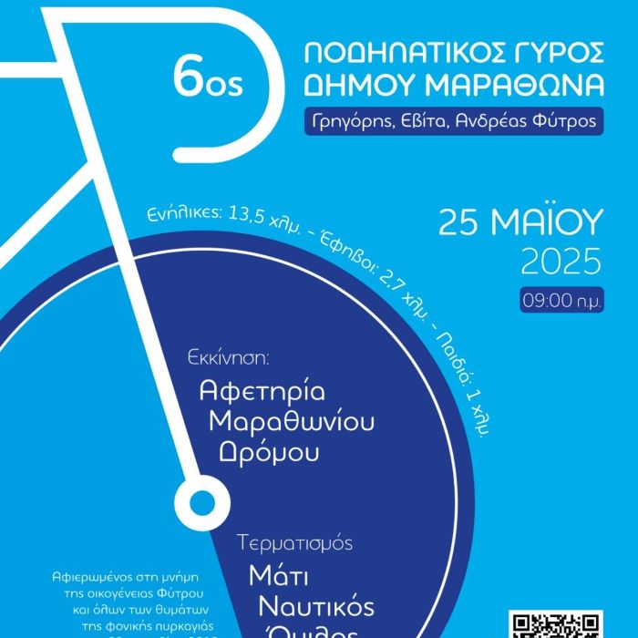 Σας προσκαλούμε στον “6ο Ποδηλατικό Γύρο Δήμου Μαραθώνα” – Γρηγόρης Εβίτα Ανδρέας Φύτρος, που θα πραγματοποιηθεί την Κυριακή 25 Μαίου 2025 (9πμ) στην Αφετηρία Μαραθωνίου Δρόμου.