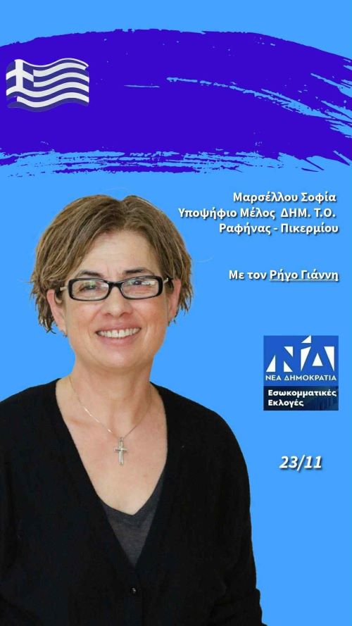 Η Σοφία Μαρσέλλου κατεβαίνει υποψήφιο μέλος της ΔΗΜΤΟ Ραφήνας Πικερμίου της ΝΔ με υποψήφιο Πρόεδρο τον Γιάννη Ρήγο.