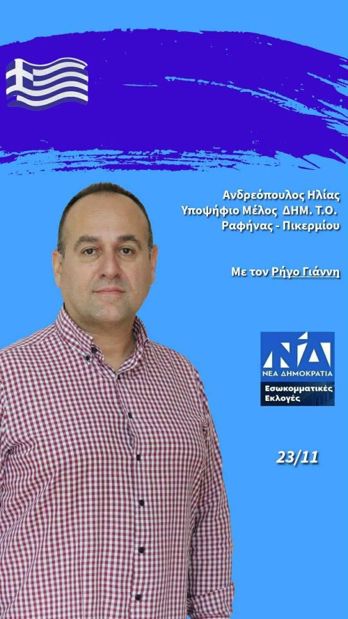 Ο Ηλίας Ανδρεόπουλος κατεβαίνει υποψήφιο μέλος της ΔΗΜΤΟ Ραφήνας Πικερμίου της ΝΔ με υποψήφιο Πρόεδρο τον Γιάννη Ρήγο.