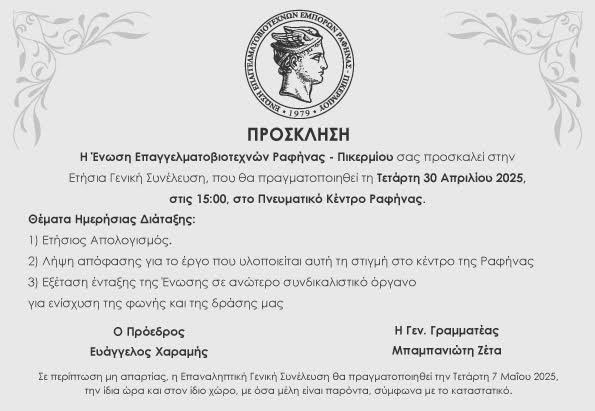 Η Ένωση Επαγγελματοβιοτεχνών Ραφήνας – Πικερμίου σας προσκαλεί στην Ετήσια Γενική Συνέλευση, που θα πραγματοποιηθεί τη Τετάρτη 30 Απριλίου 2025, στις 15:00, στο Πνευματικό Κέντρο Ραφήνας.