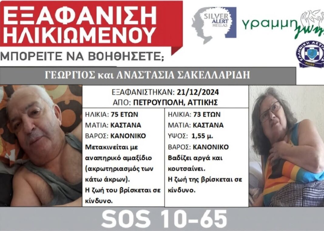 Ο Γεώργιος Σακελλαρίδης 75 ετών και η σύζυγός του Αναστασία Σακελλαρίδη 73 ετών, εξαφανίστηκαν από το σπίτι τους, στην Πετρούπολη Αττικής, το μεσημέρι της 21/12/2024.