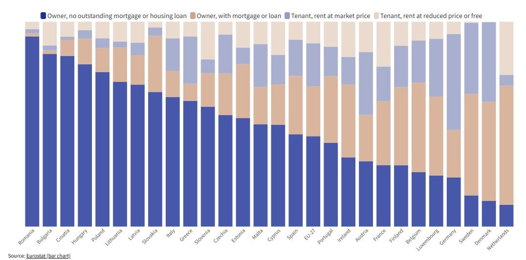 Το γράφημα συγκρίνει τις καταστάσεις στέγασης μεταξύ των ευρωπαϊκών χωρών, δείχνοντας διαφορές στην ιδιοκτησία κατοικίας και στα ποσοστά ενοικίασης. Τα δεδομένα υπογραμμίζουν τα υψηλότερα ποσοστά ιδιοκτησίας κατοικίας σε χώρες της Ανατολικής Ευρώπης, όπως η Ρουμανία, η Βουλγαρία ή η Σλοβακία, σε αντίθεση με τα υψηλότερα ποσοστά ενοικίασης σε χώρες όπως η Αυστρία, η Γερμανία και η Γαλλία.