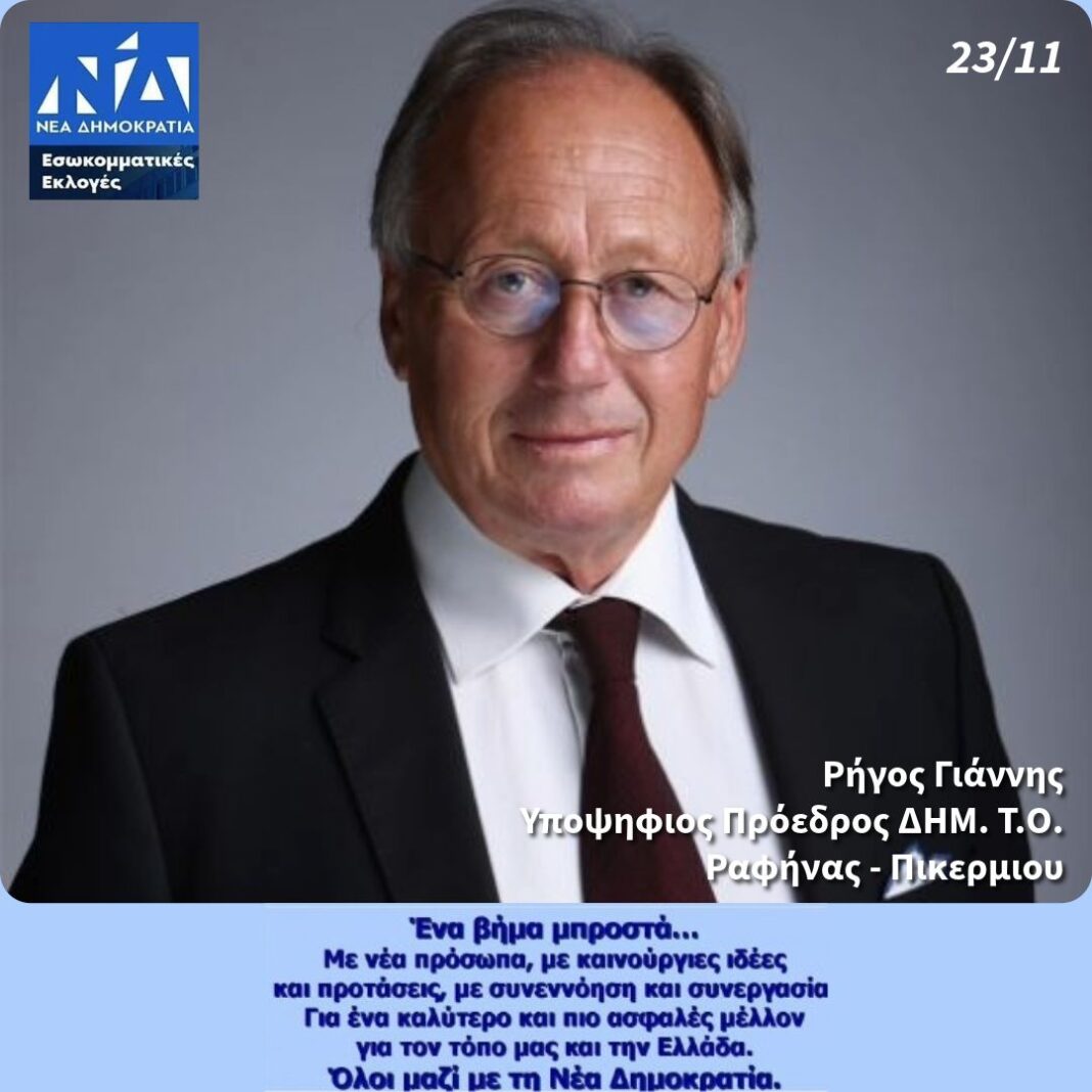 Ο Γιάννης Ρήγος, γνωστός επιχειρηματίας στο Δήμο Ραφήνας Πικερμίου και ενεργό μέλος της τοπικής κοινωνίας, δηλώνει παρών στις εσωκομματικές εκλογές της Νέας Δημοκρατίας, ανακοινώνοντας την υποψηφιότητά του για τη θέση του Προέδρου της ΔΗΜ.Τ.Ο. Ραφήνας – Πικερμίου. Με πίστη στις αρχές της παράταξης και διάθεση προσφοράς, επιδιώκει να ενώσει τις δυνάμεις όλων των μελών, προτάσσοντας το κοινό συμφέρον και την ανάπτυξη του τόπου.