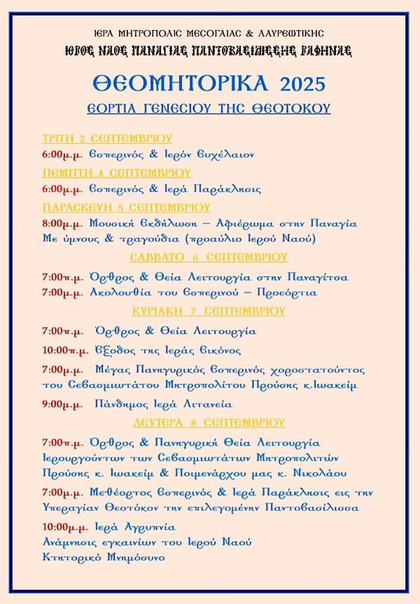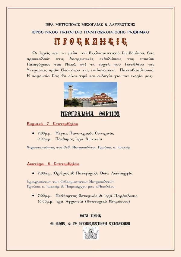 Oι Ιερείς και τα μέλη του Εκκλησιαστικού Συμβουλίου, Σας προσκαλούν στις λατρευτικές εκδηλώσεις της ετησίου Πανηγύρεως του Ναού, επί τη εορτή του Γενεθλίου της Υπεραγίας ημών Θεοτόκου της επιλεγομένης Παντοβασιλίσσης.