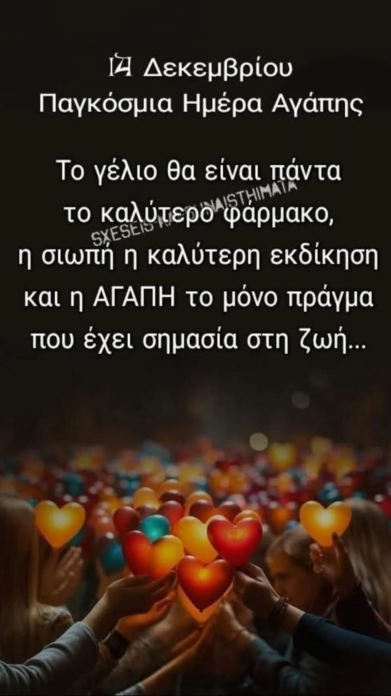 «14 Δεκεμβρίου Παγκόσμια Ημέρα Αγάπης. Το γέλιο θα είναι πάντα το καλύτερο φάρμακο, η σιωπή η καλύτερη εκδίκηση και η αγάπη το μόνο πράγμα που έχει σημασία στη ζωή…» έγραψε χαρακτηριστικά.