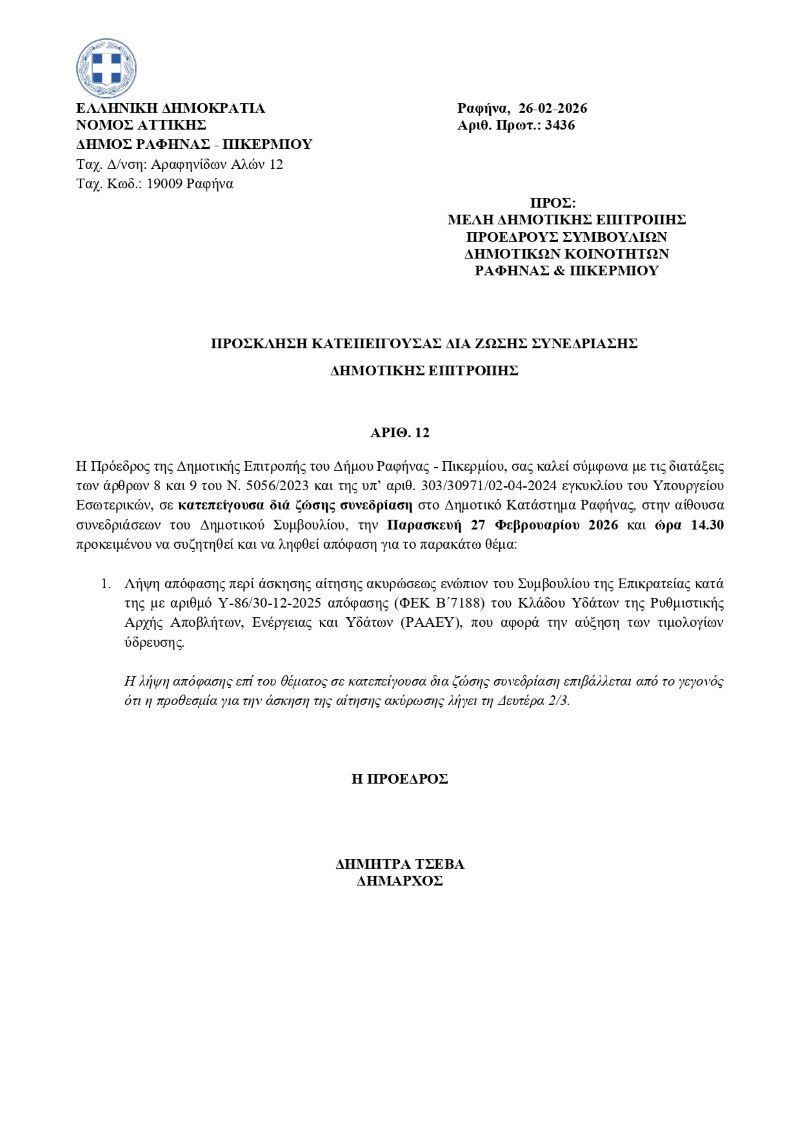 ΔΗΜΟΤΙΚΗ ΕΠΙΤΡΟΠΗ ΡΑΦΗΝΑ - ΠΙΚΕΡΜΙΤΟΠΙΚΑ ΝΕΑΤΟΠΙΚΗ ΚΟΙΝΩΝΙΑ Λιγότερο από 1 λεπταΑνάγνωση Η Δημοτική Επιτροπή Ραφήνας Πικερμίου συνεδριάζει κατεπειγόντως για την αύξηση των τιμολογίων ύδρευσης 26 Φεβρουαρίου, 2026 FacebookTwitterPinterestWhatsApp Η Δημοτική Επιτροπή Ραφήνας Πικερμίου συνεδριάζει κατεπειγόντως για την αύξηση των τιμολογίων ύδρευσης Αυτή την εβδομάδα ΔΙΑΦΟΡΑ Ανοίγει η Πλατφόρμα για το Α21 – Επίδομα Παιδιού – Δικαιούχοι/Υποβολή Αιτήσεων 26 Φεβρουαρίου, 2026 0 Το Υπουργείο Κοινωνικής Συνοχής και Οικογένειας, με τον εποπτευόμενο... ΕΚΔΗΛΩΣΕΙΣ Νηπιαγωγείο Γραμματικού: Μεγαλώνοντας μαζί – Όρια, εμπιστοσύνη και αυτονομία στα πρώτα σχολικά χρόνια 26 Φεβρουαρίου, 2026 0 Τα πρώτα σχολικά χρόνια είναι ένα μεγάλο βήμα, τόσο... ΠΑΛΛΗΝΗ Παλλήνη: Εκδήλωση Erasmus+ «Stop Forest Fire for 5 Green» του 1ου ΓΕΛ παρουσία του Δημάρχου Παλλήνης, Χρήστου Αηδόνη 26 Φεβρουαρίου, 2026 0 Με ιδιαίτερη επιτυχία πραγματοποιήθηκε την Τετάρτη 24 Φεβρουαρίου 2026... ΡΑΦΗΝΑ - ΠΙΚΕΡΜΙ Συνελήφθησαν στη Ραφήνα 2 άτομα για κατοχή και διακίνηση ναρκωτικών ουσιών (βίντεο) 26 Φεβρουαρίου, 2026 0 Από την Υποδιεύθυνση Δίωξης Ναρκωτικών της Διεύθυνσης Αντιμετώπισης Οργανωμένου... ΕΚΔΗΛΩΣΕΙΣ Ραφήνα: Στο πρώτο Hello Voices, οι μαθητές μας θα μιλήσουν για το σχολείο που ονειρεύονται 26 Φεβρουαρίου, 2026 0 Hello Voices #1 Education Today – The School I Dream... ΝΕΑ ΔΙΑΦΟΡΑ Ανοίγει η Πλατφόρμα για το Α21 – Επίδομα Παιδιού – Δικαιούχοι/Υποβολή Αιτήσεων 0 Το Υπουργείο Κοινωνικής Συνοχής και Οικογένειας, με τον εποπτευόμενο... ΕΚΔΗΛΩΣΕΙΣ Νηπιαγωγείο Γραμματικού: Μεγαλώνοντας μαζί – Όρια, εμπιστοσύνη και αυτονομία στα πρώτα σχολικά χρόνια 0 Τα πρώτα σχολικά χρόνια είναι ένα μεγάλο βήμα, τόσο... ΠΑΛΛΗΝΗ Παλλήνη: Εκδήλωση Erasmus+ «Stop Forest Fire for 5 Green» του 1ου ΓΕΛ παρουσία του Δημάρχου Παλλήνης, Χρήστου Αηδόνη 0 Με ιδιαίτερη επιτυχία πραγματοποιήθηκε την Τετάρτη 24 Φεβρουαρίου 2026... ΡΑΦΗΝΑ - ΠΙΚΕΡΜΙ Συνελήφθησαν στη Ραφήνα 2 άτομα για κατοχή και διακίνηση ναρκωτικών ουσιών (βίντεο) 0 Από την Υποδιεύθυνση Δίωξης Ναρκωτικών της Διεύθυνσης Αντιμετώπισης Οργανωμένου... ΕΚΔΗΛΩΣΕΙΣ Ραφήνα: Στο πρώτο Hello Voices, οι μαθητές μας θα μιλήσουν για το σχολείο που ονειρεύονται 0 Hello Voices #1 Education Today – The School I Dream... ΜΑΡΑΘΩΝΑΣ - ΝΕΑ ΜΑΚΡΗ Σήμερα, 26/2 η Ειδική Τακτική Συνεδρίαση του Δημοτικού Συμβουλίου Δήμου Μαραθώνος 0 Σε ζωντανή μετάδοση η 4η και 5η Ειδική Τακτική... ΕΙΔΗΣΕΙΣ Χάος στη Φλώρινα: Ρομά έστειλαν στο νοσοκομείο ανθυπαστυνόμο μετά από άγρια καταδίωξη 0 Σοβαρό επεισόδιο σημειώθηκε στη Φλώρινα το βράδυ της Τετάρτης... ΚΑΙΡΟΣ Τι ώρα θα αρχίσει να βρέχει σήμερα στην Αττική 0 Αλλαγή σκηνικού φέρνει ο καιρός σήμερα, με αυξημένες νεφώσεις... RPN.GR Νηπιαγωγείο Γραμματικού: Μεγαλώνοντας μαζί – Όρια, εμπιστοσύνη και αυτονομία στα πρώτα σχολικά χρόνια ΕΚΔΗΛΩΣΕΙΣ 26 Φεβρουαρίου, 2026 Συνελήφθησαν στη Ραφήνα 2 άτομα για κατοχή και διακίνηση ναρκωτικών ουσιών (βίντεο) ΡΑΦΗΝΑ - ΠΙΚΕΡΜΙ 26 Φεβρουαρίου, 2026 Ραφήνα: Στο πρώτο Hello Voices, οι μαθητές μας θα μιλήσουν για το σχολείο που ονειρεύονται ΕΚΔΗΛΩΣΕΙΣ 26 Φεβρουαρίου, 2026 Σήμερα, 26/2 η Ειδική Τακτική Συνεδρίαση του Δημοτικού Συμβουλίου Δήμου Μαραθώνος ΜΑΡΑΘΩΝΑΣ - ΝΕΑ ΜΑΚΡΗ 26 Φεβρουαρίου, 2026 Γραμματικό: Εκδήλωση για την Παγκόσμια Ημέρα της Γυναίκας ΕΚΔΗΛΩΣΕΙΣ 26 Φεβρουαρίου, 2026 ΕΙΔΗΣΕΙΣΡΑΦΗΝΑ - ΠΙΚΕΡΜΙΑΘΛΗΤΙΚΑΜΑΡΑΘΩΝΑΣ - ΝΕΑ ΜΑΚΡΗΕΚΔΗΛΩΣΕΙΣΤΟΠΙΚΗ ΚΟΙΝΩΝΙΑΔΙΑΦΟΡΑ Προηγούμενο άρθροΠαλλήνη: Εκδήλωση Erasmus+ «Stop Forest Fire for 5 Green» του 1ου ΓΕΛ παρουσία του Δημάρχου 