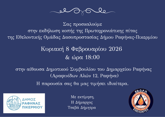 ΕΘΟΡΠ ΡΑΦΗΝΑ - ΠΙΚΕΡΜΙΤΟΠΙΚΑ ΝΕΑΤΟΠΙΚΗ ΚΟΙΝΩΝΙΑ Λιγότερο από 1 λεπταΑνάγνωση Η Εθελοντική Ομάδα Δασοπροστασίας του Δήμου Ραφήνας – Πικερμίου κόβει την βασιλόπιτα 6 Φεβρουαρίου, 2026 FacebookTwitterPinterestWhatsApp Εκδήλωση κοπής πίτας της Εθελοντικής Ομάδας Δασοπροστασίας του Δήμου Ραφήνας – Πικερμίου την Κυριακή 8 Φεβρουαρίου 2026 στην αίθουσα Δημοτικού Συμβουλίου. TagsΕΘΟΡΠ Αυτή την εβδομάδα ΡΑΦΗΝΑ - ΠΙΚΕΡΜΙ Πικέρμι: Διάρρηξη-εξπρές στη Διώνη – Τρεις κουκουλοφόροι άδειασαν σπίτι σε λίγα λεπτά 6 Φεβρουαρίου, 2026 0 Διάρρηξη σημειώθηκε το βράδυ της Πέμπτης 5/2, γύρω στις... ΡΑΦΗΝΑ - ΠΙΚΕΡΜΙ Ραφήνα: Τιμητική βράβευση διακεκριμένων αθλητών και μαραθωνοδρόμων, τo Σάββατο 28 Μαρτίου 6 Φεβρουαρίου, 2026 0 Ο Δήμος Ραφήνας-Πικερμίου ενημερώνει ότι τo Σάββατο 28 Μαρτίου, παραμονή της... ΡΑΦΗΝΑ - ΠΙΚΕΡΜΙ Η Ένωση Συλλόγων Γονέων Δήμου Ραφήνας -Πικερμίου κόβει βασιλόπιτα την Παρασκευή 13/2 6 Φεβρουαρίου, 2026 0 Αποκριές χωρίς γλέντι δεν γίνονται! Ελάτε να κόψουμε τη βασιλόπιτα,... ΔΙΑΦΟΡΑ Σε δημόσια διαβούλευση Σχέδιο Νόμου για τις Μεταφορές – Τσουχτερά τα πρόστιμα για την εισιτηριοδιαφυγή 6 Φεβρουαρίου, 2026 0 Σε δημόσια ηλεκτρονική διαβούλευση έθεσε το Υπουργείο Υποδομών και... ΔΙΑΦΟΡΑ Γραμμή 2 – Μετρό: Κυκλοφοριακές ρυθμίσεις – οι σταθμοί που θα κλείνουν νωρίς 6 Φεβρουαρίου, 2026 0 Κυκλοφοριακές ρυθμίσεις από την Κυριακή 8/2 στη Γραμμή 2... ΝΕΑ ΡΑΦΗΝΑ - ΠΙΚΕΡΜΙ Πικέρμι: Διάρρηξη-εξπρές στη Διώνη – Τρεις κουκουλοφόροι άδειασαν σπίτι σε λίγα λεπτά 0 Διάρρηξη σημειώθηκε το βράδυ της Πέμπτης 5/2, γύρω στις... ΡΑΦΗΝΑ - ΠΙΚΕΡΜΙ Ραφήνα: Τιμητική βράβευση διακεκριμένων αθλητών και μαραθωνοδρόμων, τo Σάββατο 28 Μαρτίου 0 Ο Δήμος Ραφήνας-Πικερμίου ενημερώνει ότι τo Σάββατο 28 Μαρτίου, παραμονή της... ΡΑΦΗΝΑ - ΠΙΚΕΡΜΙ Η Ένωση Συλλόγων Γονέων Δήμου Ραφήνας -Πικερμίου κόβει βασιλόπιτα την Παρασκευή 13/2 0 Αποκριές χωρίς γλέντι δεν γίνονται! Ελάτε να κόψουμε τη βασιλόπιτα,... ΔΙΑΦΟΡΑ Σε δημόσια διαβούλευση Σχέδιο Νόμου για τις Μεταφορές – Τσουχτερά τα πρόστιμα για την εισιτηριοδιαφυγή 0 Σε δημόσια ηλεκτρονική διαβούλευση έθεσε το Υπουργείο Υποδομών και... ΔΙΑΦΟΡΑ Γραμμή 2 – Μετρό: Κυκλοφοριακές ρυθμίσεις – οι σταθμοί που θα κλείνουν νωρίς 0 Κυκλοφοριακές ρυθμίσεις από την Κυριακή 8/2 στη Γραμμή 2... ΔΙΑΦΟΡΑ Μεγάλη Αστυνομική Επιχείρηση για λαθραία τσιγάρα – Συλλήψεις σε Αθήνα και Βοιωτία 0 Από τις πρώτες πρωινές ώρες της Παρασκευής βρίσκεται σε... ΔΙΑΦΟΡΑ Σορός εντοπίστηκε σε φλεγόμενο όχημα στη Σφενδάμη Πιερίας 0 Σορός, αγνώστων στοιχείων, εντοπίστηκε μέσα σε φλεγόμενο όχημα στην... ΔΙΑΦΟΡΑ Άμεση η κινητοποίηση για τη διαρροή προπανίου σε φαρμακοβιομηχανία στο Κρυονέρι 0 Συναγερμός σήμανε στις Αρχές το μεσημέρι της Πέμπτης 5/2... RPN.GR Πικέρμι: Διάρρηξη-εξπρές στη Διώνη – Τρεις κουκουλοφόροι άδειασαν σπίτι σε λίγα λεπτά ΡΑΦΗΝΑ - ΠΙΚΕΡΜΙ 6 Φεβρουαρίου, 2026 Ραφήνα: Τιμητική βράβευση διακεκριμένων αθλητών και μαραθωνοδρόμων, τo Σάββατο 28 Μαρτίου ΡΑΦΗΝΑ - ΠΙΚΕΡΜΙ 6 Φεβρουαρίου, 2026 Η Ένωση Συλλόγων Γονέων Δήμου Ραφήνας -Πικερμίου κόβει βασιλόπιτα την Παρασκευή 13/2 ΡΑΦΗΝΑ - ΠΙΚΕΡΜΙ 6 Φεβρουαρίου, 2026 Ανταπόκριση εκπαιδευτικών και γονέων στο σεμινάριο Βασικής Υποστήριξης Ζωής στον Βαρνάβα ΜΑΡΑΘΩΝΑΣ - ΝΕΑ ΜΑΚΡΗ 6 Φεβρουαρίου, 2026 Κανονικά φεύγουν τα πλοία από Ραφήνα – Απεργία στο λιμάνι του Πειραιά- Δεν εκτελούνται δρομολόγια ΡΑΦΗΝΑ - ΠΙΚΕΡΜΙ 6 Φεβρουαρίου, 2026 ΕΙΔΗΣΕΙΣΡΑΦΗΝΑ - ΠΙΚΕΡΜΙΑΘΛΗΤΙΚΑΜΑΡΑΘΩΝΑΣ - ΝΕΑ ΜΑΚΡΗΕΚΔΗΛΩΣ