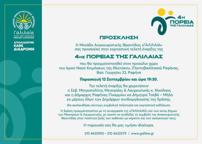 Η Φιλαρμονική Ραφήνας Πικερμίου έχει την χαρά και την τιμή να συμμετάσχει στην “4η Πορεία Γαλιλαίας” που διοργανώνει η Μονάδα Ανακουφιστικής Φροντίδας “ΓΑΛΙΛΑΙΑ” της Ι. Μ. Μεσογαίας & Λαυρεωτικής, που θα πραγματοποιηθεί σήμερα Παρασκευή 12 Σεπτεμβρίου στις 19.00 στον προαύλιο χώρο του Ι.Ν. Κοιμήσεως της Θεοτόκου (Παντοβασίλισσα) στη Ραφήνα.