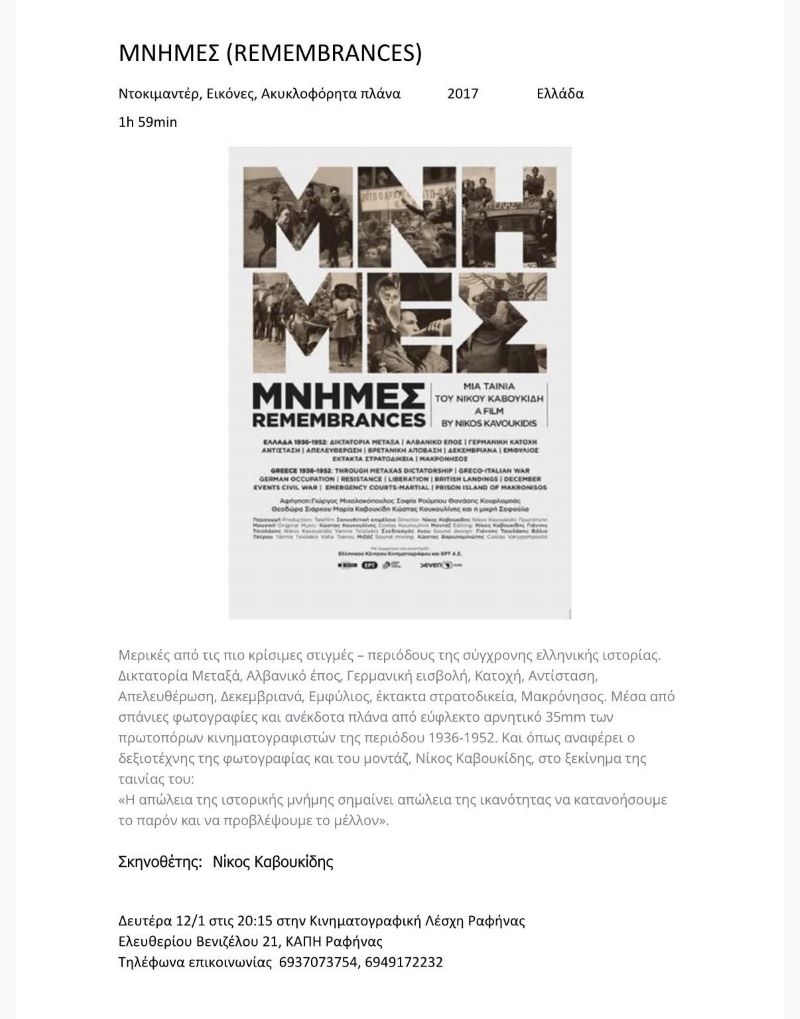 Μια κρίσιμη περίοδος που σημάδεψε τη σύγχρονη ιστορία της χώρας μας, θα ζωντανέψει μπροστά στα μάτια των φίλων του Κινηματογράφου από τη Ραφήνα και το Πικέρμι, μέσω μιας σύνθεσης από συγκλονιστικές εικόνες, ακυκλοφόρητα πλάνα, τραγούδια της εποχής και υπέροχους στίχους ποιητών/ποιητριών εκείνης της αλησμόνητης περιόδου. Ειδικά τα ακυκλοφόρητα πλάνα των πρωτοπόρων κινηματογραφιστών της δεκαετίας του 1940, είναι μια ανεπανάληπτη εμπειρία για κάθε ευαισθητοποιημένο Έλληνα που ενδιαφέρεται για την ιστορία του τόπου του.