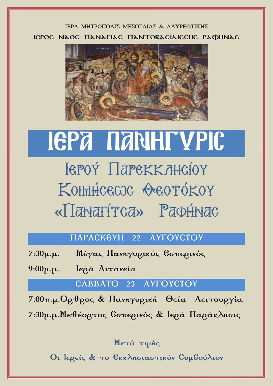 Ιερά Πανήγυρις Ιερού Παρεκκλησίου Κοιμήσεως Θεοτόκου ”Παναγίτσα” Ραφήνας, διά την Απόδοση της εορτής της Κοιμήσεως της Θεοτόκου.