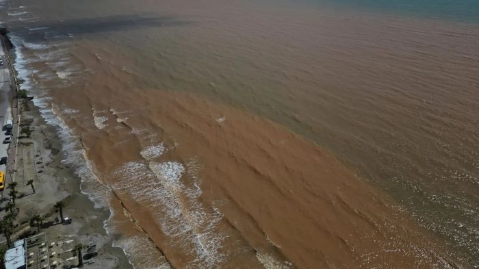 Φωτογραφίες από drone του Associoated Press καταγράφουν την παραλία του Μαραθώνα ως έναν απέραντο λασπότοπο, ύστερα από τις καταρρακτώδεις που έπεσαν στην περιοχή