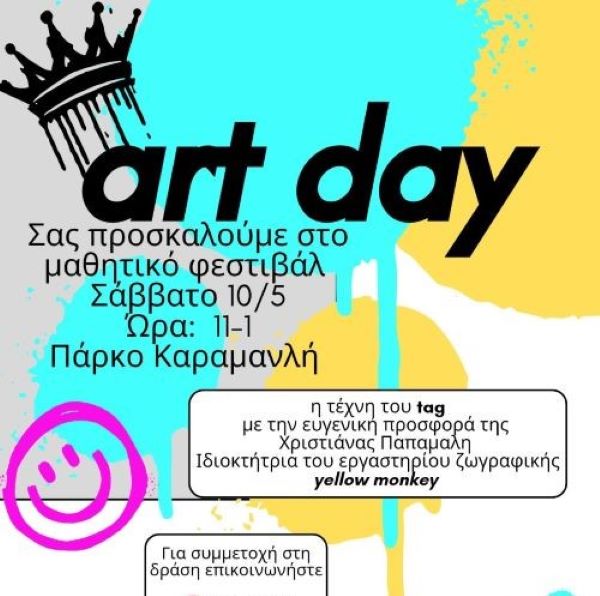 Στο πλαίσιο του Μαθητικού Φεστιβάλ που θα πραγματοποιηθεί το Σάββατο 10 Μαΐου, από τις 11:00 έως τις 13:00 στο Πάρκο Καραμανλή, θα διεξαχθεί η δράση «Η τέχνη του tag». Τη δημιουργική αυτή δραστηριότητα προσφέρει ευγενικά η Χριστιάνα Παπαμαλή, ιδιοκτήτρια του εργαστηρίου ζωγραφικής Yellow Monkey.