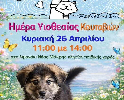 Ο Σύλλογος Ζωόφιλων Μαραθώνα «Ελπίδα» διοργανώνει Ημέρα Υιοθεσίας Κουταβιών την Κυριακή 26 Απριλίου, από 11:00 έως 14:00, στο Λιμανάκι Νέας Μάκρης (κοντά στην παιδική χαρά).