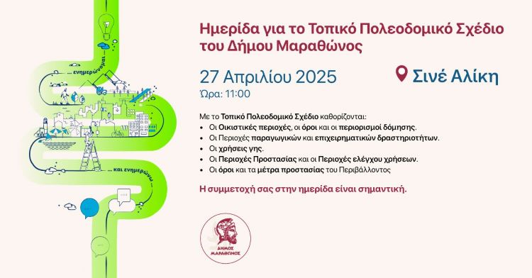 Την Κυριακή 27/4/2025 στις 11:00, ο Δήμος Μαραθώνα σας προσκαλεί να παρακολουθήσετε την Δημόσια παρουσίαση των εναλλακτικών σεναρίων του 1ου σταδίου της μελέτης του Τοπικού Πολεοδομικού Σχεδίου (ΤΠΣ) του Δήμου μας.