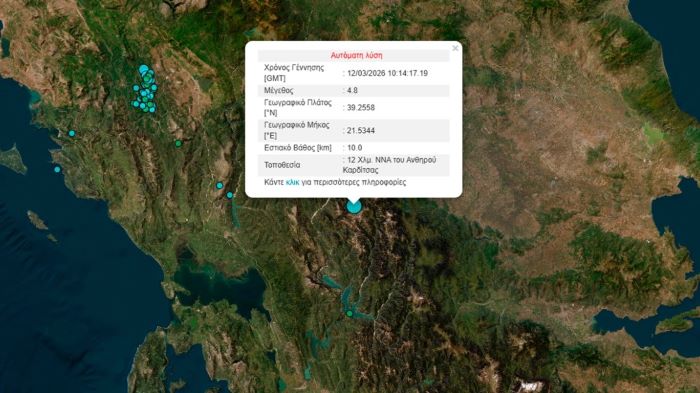 Σεισμός σημειώθηκε λίγο μετά τις 12:18 κοντά στην Καρδίτσα με την έντασή του να υπολογίζεται στα 4,7 Ρίχτερ.