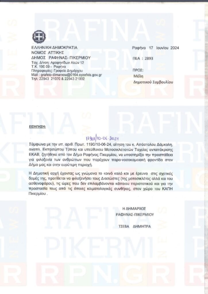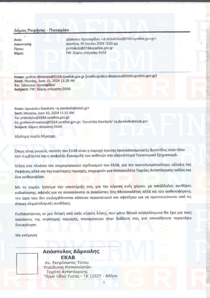 Ο δήμος μετά από λίγες ημέρες, στις 17/6/2024, απαντώντας στο ΕΚΑΒ, πρότεινε τον χώρο του ΚΑΠΗ Πικερμίου (ακολουθεί το επίσημο έγγραφο). Επειδή όμως θα δημιουργείτο πρόβλημα γιατί θα είχε επί 24ωρου βάσεως τα κλειδιά ενός δημοτικού χώρου κάποια άλλη υπηρεσία, τελικά τοποθετήθηκε την προηγούμενη Παρασκευή ένα κοντέινερ με 2 δωμάτια και ένα μπάνιο, στην διασταύρωση Ραφήνας δίπλα στο ΚΕΘΕΑ (σε ιδιόκτητο οικόπεδο του δήμου μας). Αυτά μας τα ανέφερε η Δήμαρχος Δήμητρα Τσεβά, όταν την καλέσαμε τηλεφωνικά κατά την διάρκεια της εκπομπής μας της 26/2/2025 (δείτε στο 00.17′.50 του βίντεο που ακολουθεί) -μετά τα έγγραφα-. Την επόμενη ημέρα όμως της τοποθέτησης του κοντέινερ έγινε καταγγελία στο Δασαρχείο οπότε ο δήμος είναι υποχρεωμένος να το πάρει από κει. Την ώρα που γράφονται αυτές οι γραμμές, βρισκόμαστε στο Δημαρχείο Ραφήνας, όπου βρίσκεται σε εξέλιξη συνεδρίαση του Δημοτικού Συμβουλίου. Σχετική ερώτηση για το θέμα έκανε ο Δημοτικός Σύμβουλος Παύλος Μπατάλης και η Δήμαρχος τον διαβεβαίωσε ότι θα βρεθεί χώρος με τις προδιαγραφές που ζητά το ΕΚΑΒ. Το ευχόμαστε. Εμείς πάντως θα σας κρατάμε ενήμερους για κάθε σχετική εξέλιξη. Πραγματικά αξίζει να παρακολουθήσετε την εκπομπή μας στο βίντεο που ακολουθεί, και να βγάλετε τα συμπεράσματά σας. Ρεπορτάζ Κατερίνα Τράση