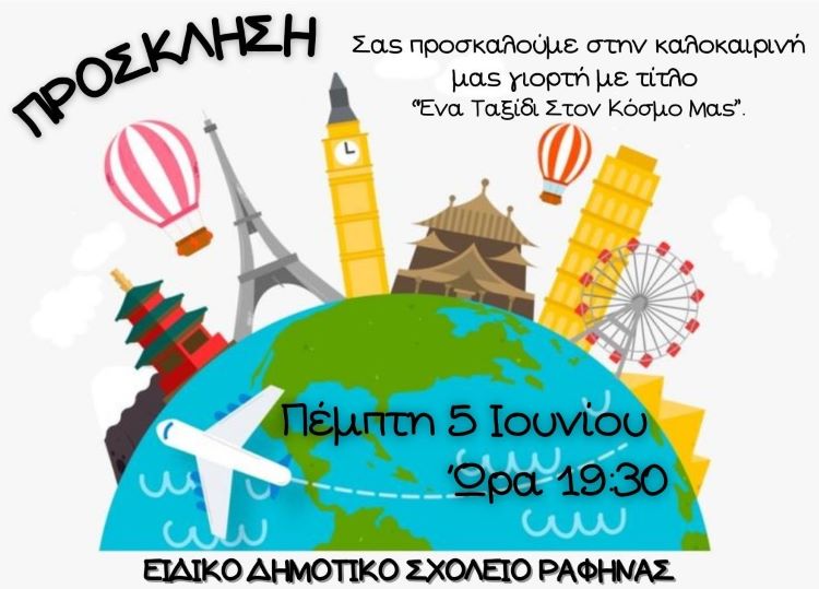 Το Ειδικό Δημοτικό Σχολείο Ραφήνας με ιδιαίτερη χαρά και συγκίνηση προσκαλεί γονείς, φίλους και την τοπική κοινωνία στην καλοκαιρινή του γιορτή, με τίτλο: