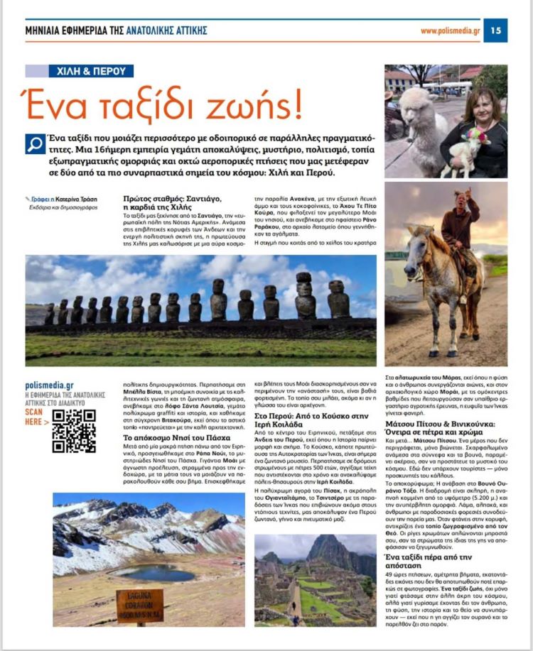 Ένα ταξίδι που μοιάζει περισσότερο με οδοιπορικό σε παράλληλες πραγματικότητες. Μια 16ήμερη εμπειρία γεμάτη αποκαλύψεις, μυστήριο, πολιτισμό, τοπία εξωπραγματικής ομορφιάς και οκτώ αεροπορικές πτήσεις που μας μετέφεραν σε δύο από τα πιο συναρπαστικά σημεία του κόσμου: Χιλή και Περού.