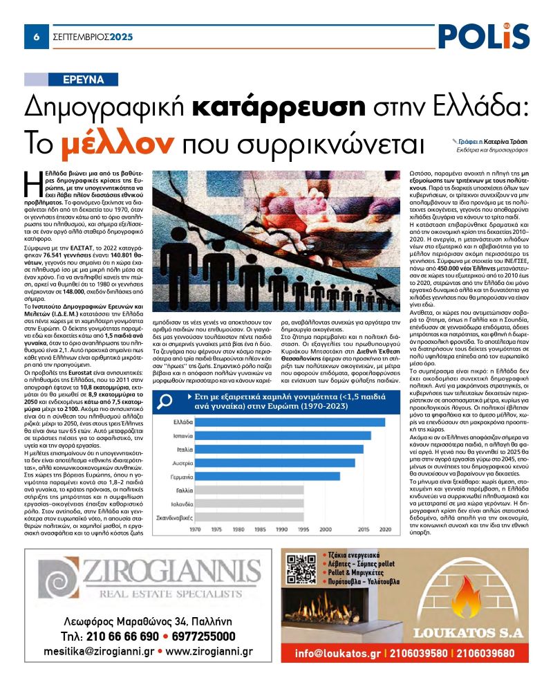 Το μήνυμα είναι ξεκάθαρο: χωρίς άμεση, στοχευμένη και γενναία παρέμβαση, η Ελλάδα κινδυνεύει να συρρικνωθεί πληθυσμιακά και να μετατραπεί σε μια χώρα γερόντων. Η δημογραφική κρίση δεν είναι απλώς στατιστικό δεδομένο, αλλά απειλή για την οικονομία, την κοινωνική συνοχή και την ίδια την εθνική ύπαρξη.
