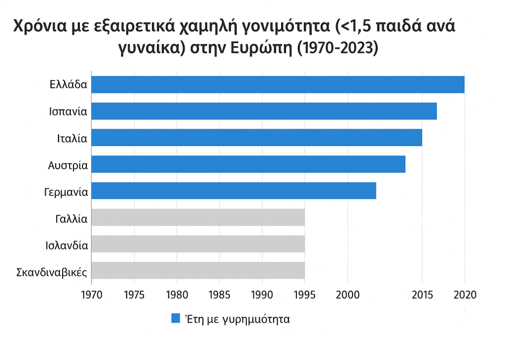 Οι μελέτες επισημαίνουν ότι η υπογεννητικότητα δεν είναι αποτέλεσμα «εθνικής ιδιαιτερότητας», αλλά κοινωνικοοικονομικών συνθηκών. Στις χώρες της βόρειας Ευρώπης, όπου η γονιμότητα παραμένει κοντά στο 1,8–2 παιδιά ανά γυναίκα, το κράτος πρόνοιας, οι πολιτικές στήριξης της μητρότητας και η συμφιλίωση εργασίας–οικογένειας έπαιξαν καθοριστικό ρόλο. Στον αντίποδα, στην Ελλάδα και γενικότερα στον ευρωπαϊκό νότο, η απουσία σταθερών πολιτικών, οι χαμηλοί μισθοί, η εργασιακή ανασφάλεια και το υψηλό κόστος ζωής εμπόδισαν τις νέες γενιές να αποκτήσουν τον αριθμό παιδιών που επιθυμούσαν. Οι γιαγιάδες μας γεννούσαν τουλάχιστον πέντε παιδιά και οι σημερινές γυναίκες μετά βίας ένα ή δύο. Τα ζευγάρια που φέρνουν στον κόσμο περισσότερα από τρία παιδιά θεωρούνται πλέον κάτι σαν ”ήρωες” της ζωής. Σημαντικό ρόλο παίζει βέβαια και η απόφαση πολλών γυναικών να μορφωθούν περισσότερο και να κάνουν καριέρα, αναβάλλοντας συνεχώς για αργότερα την δημιουργία οικογένειας.