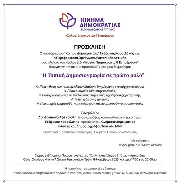 Τρίτη, 18 Νοεμβρίου, Πνευματικό Κέντρο Δήμου Σπάτων- Αρτέμιδας